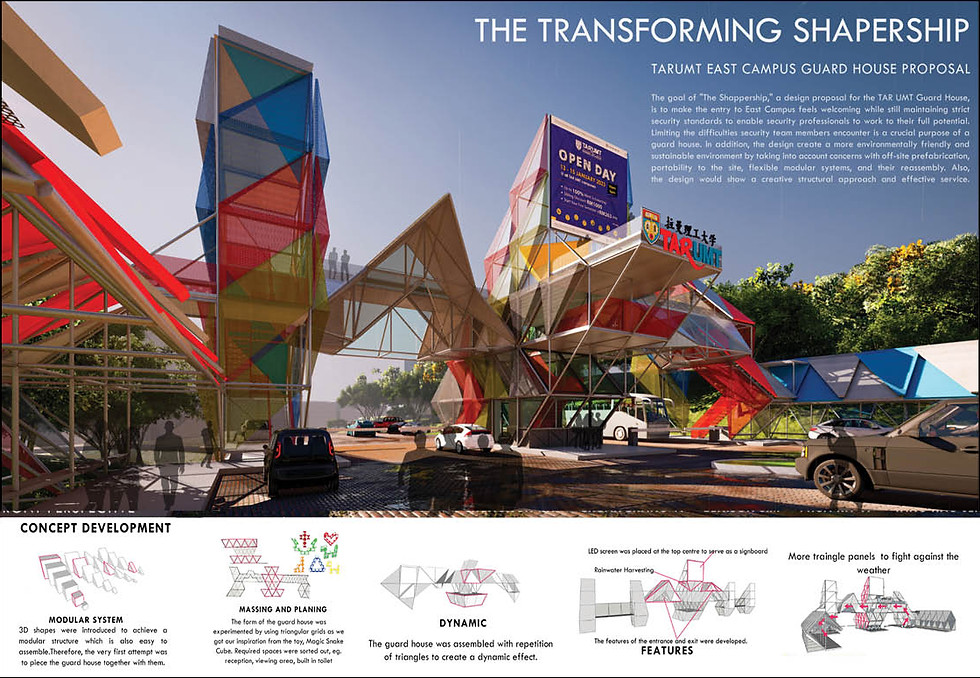 The goal of "The Shappership," a design proposal for the TAR UMT Guard House, is to make the entry to East Campus feel welcoming while still maintaining strict security standards to enable security professionals to work to their full potential. Limiting the difficulties security team members encounter is a crucial purpose of a guard house. In addition, the design creates a more environmentally friendly and sustainable environment by taking into account concerns with off-site prefabrication, portability to the site, flexible modular systems, and their reassembly. Also, the design would show a creative structural approach and effective service.